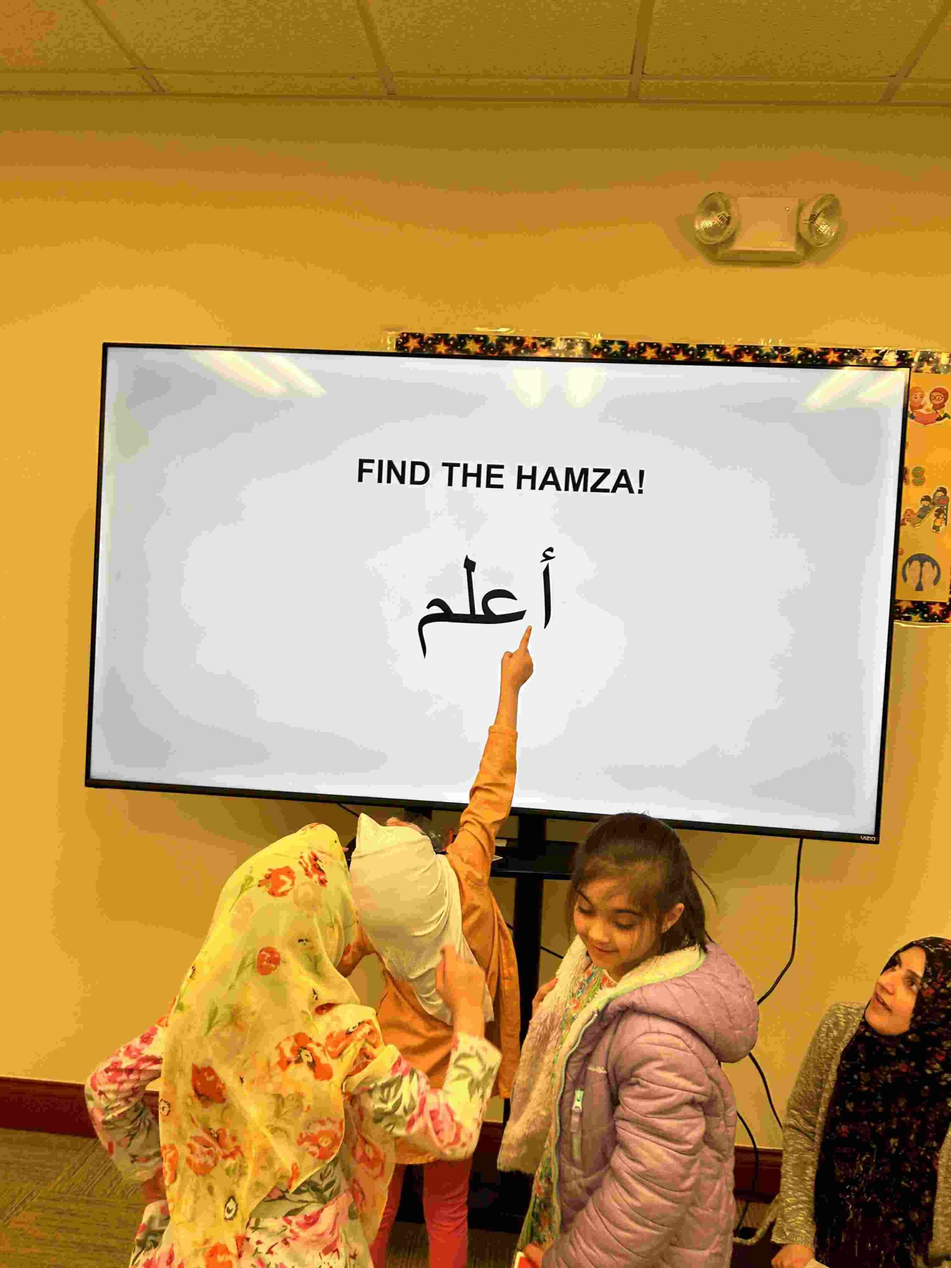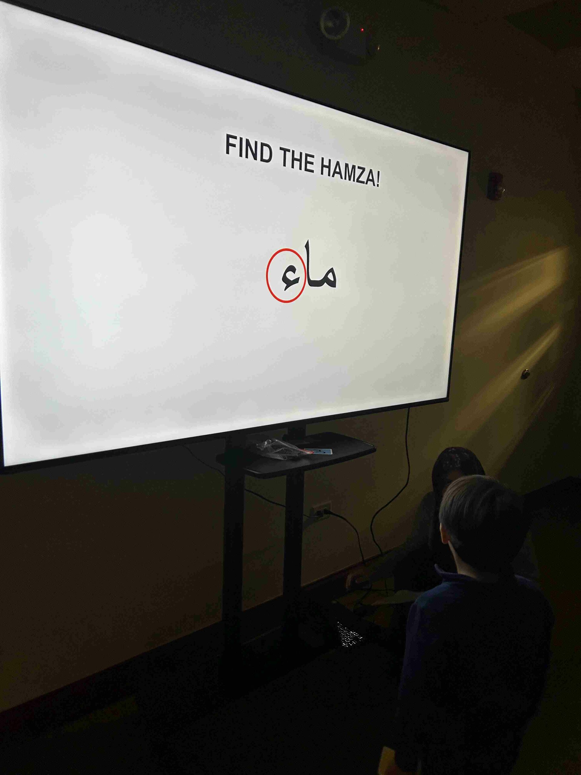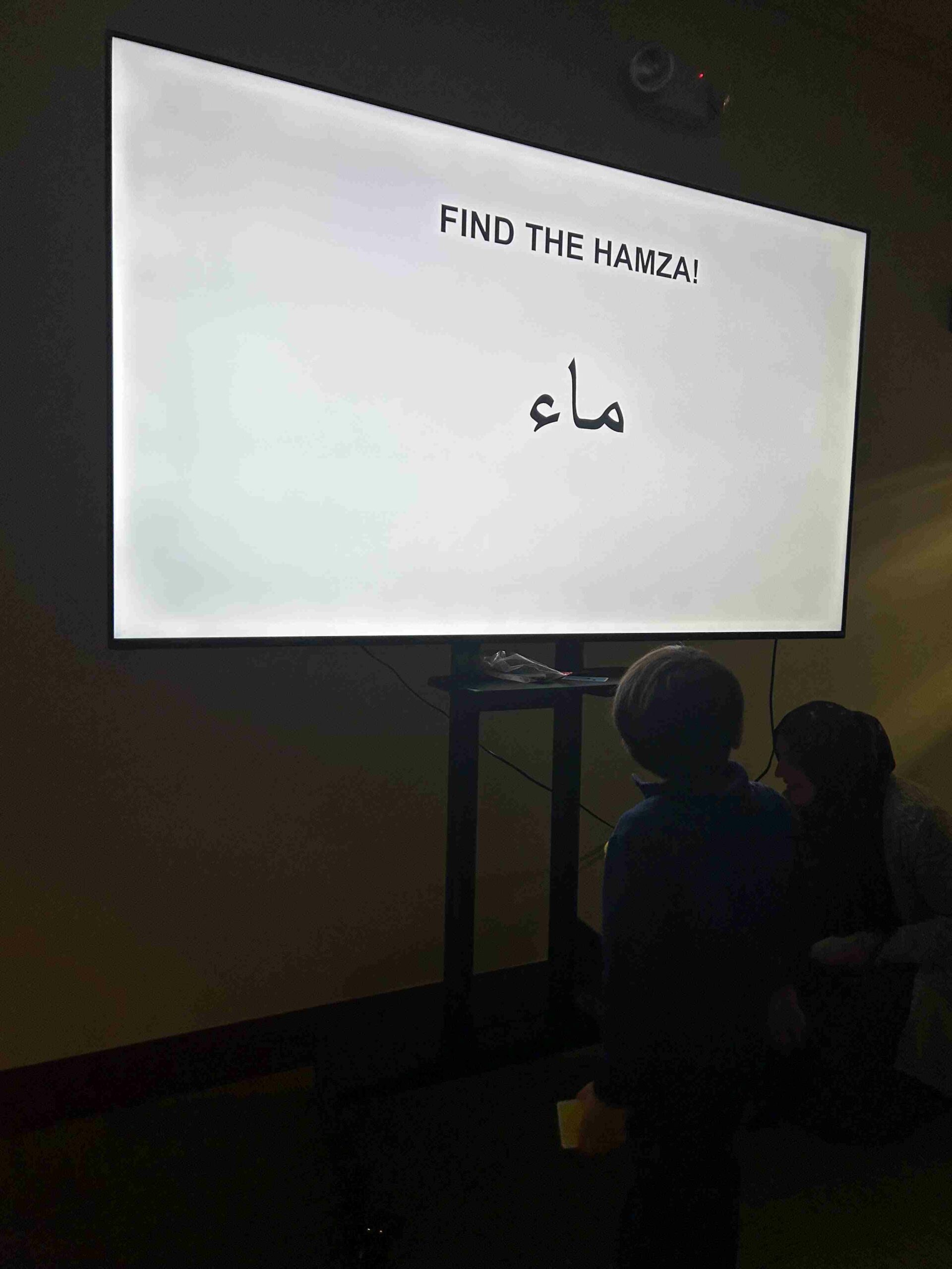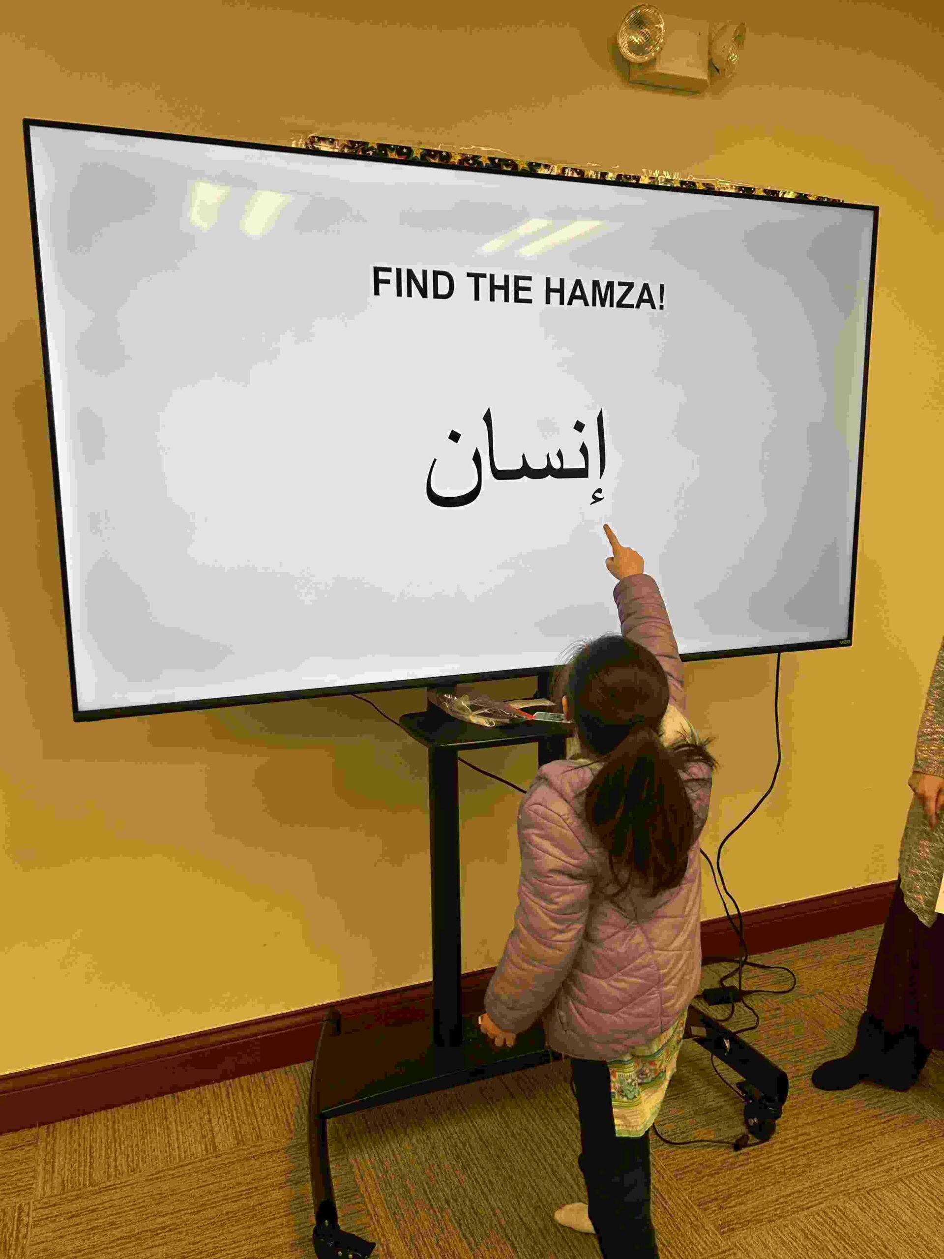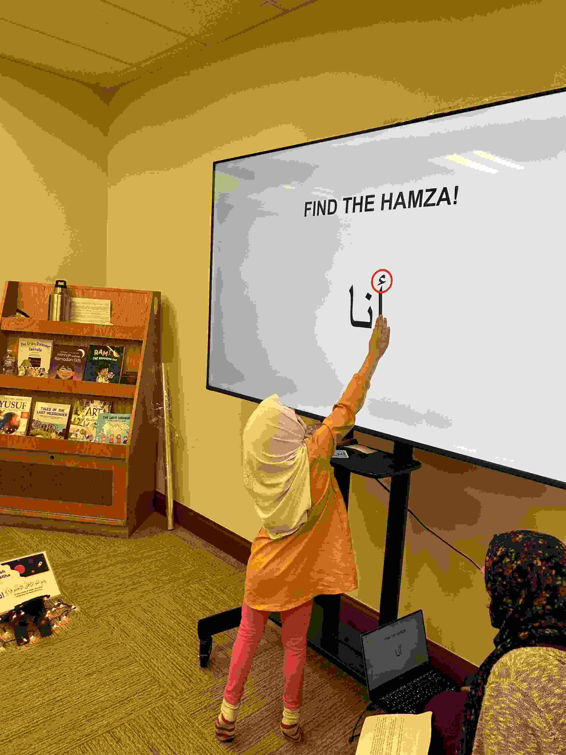 HAMZA: Kids were introduced to Hamza with a short poem and story to demonstrate how it’s a special letter that doesn’t change its shape but can be found on its own or sitting on top of or below other letters.