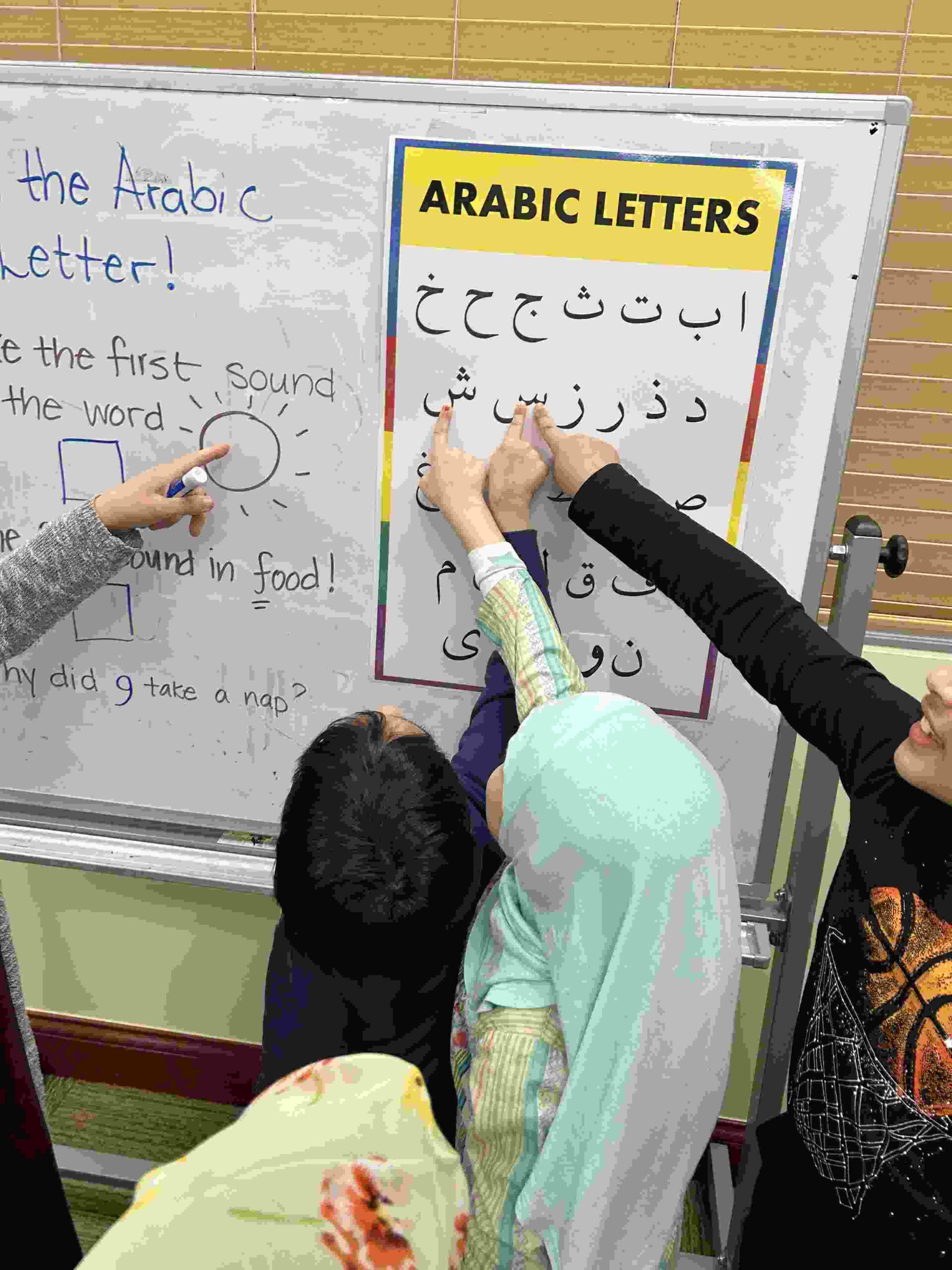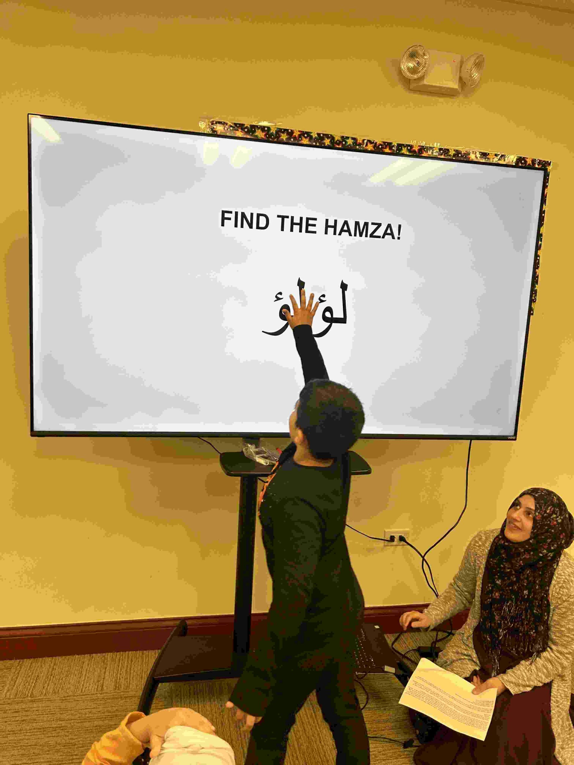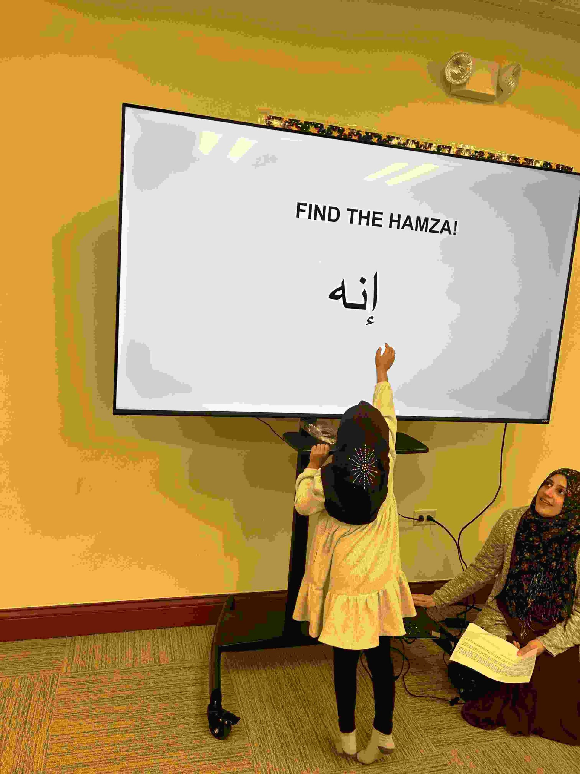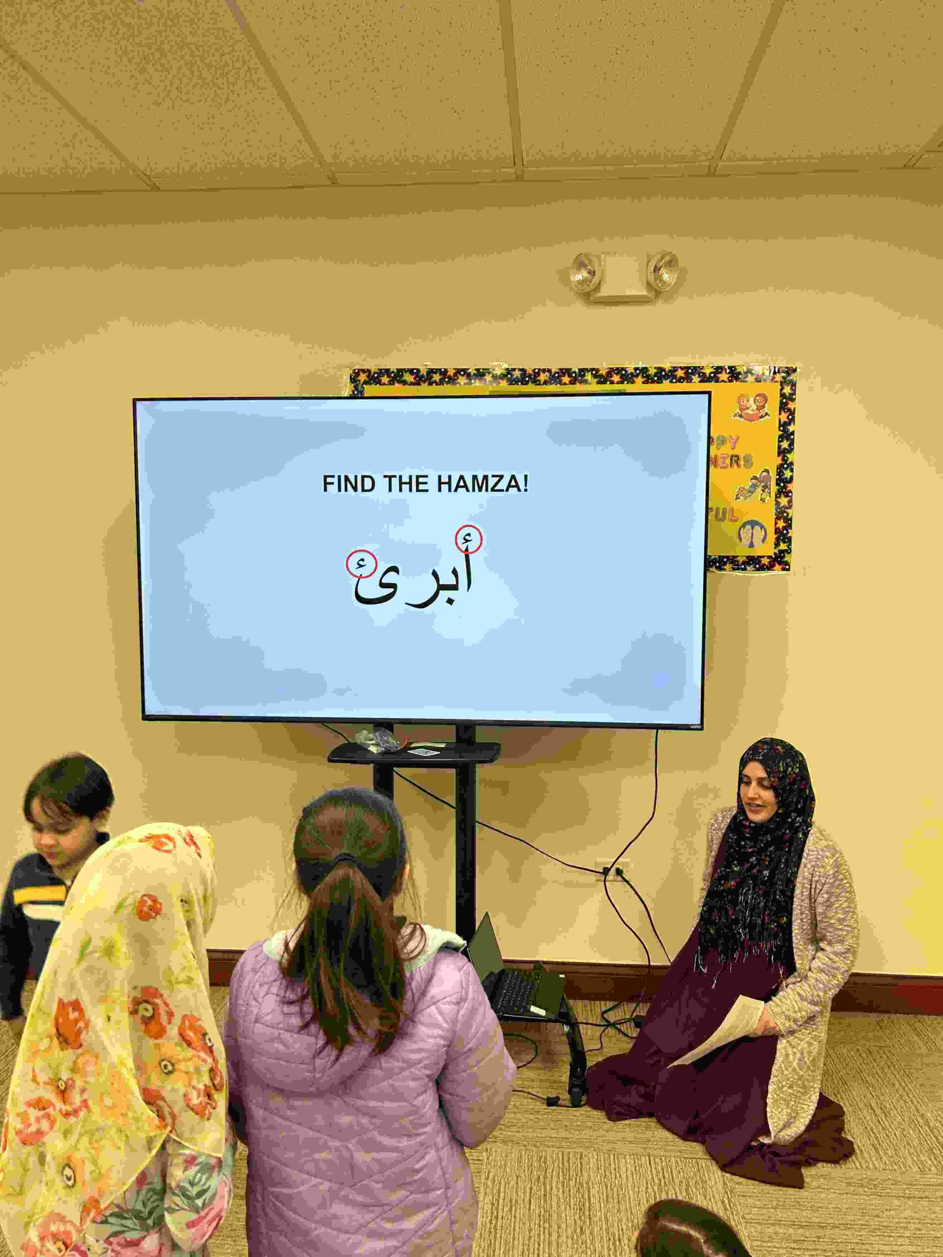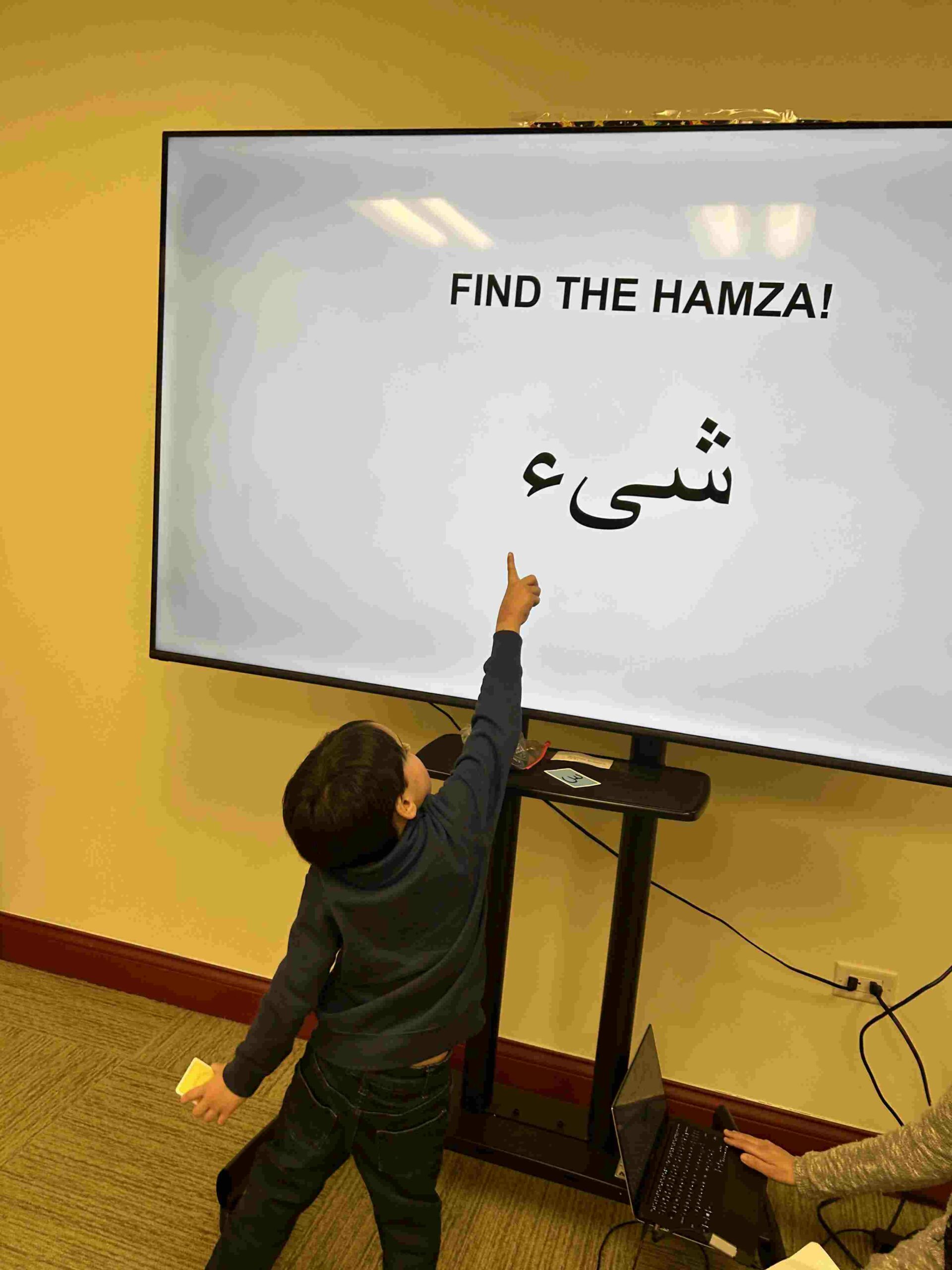 HAMZA: Kids were introduced to Hamza with a short poem and story to demonstrate how it’s a special letter that doesn’t change its shape but can be found on its own or sitting on top of or below other letters.