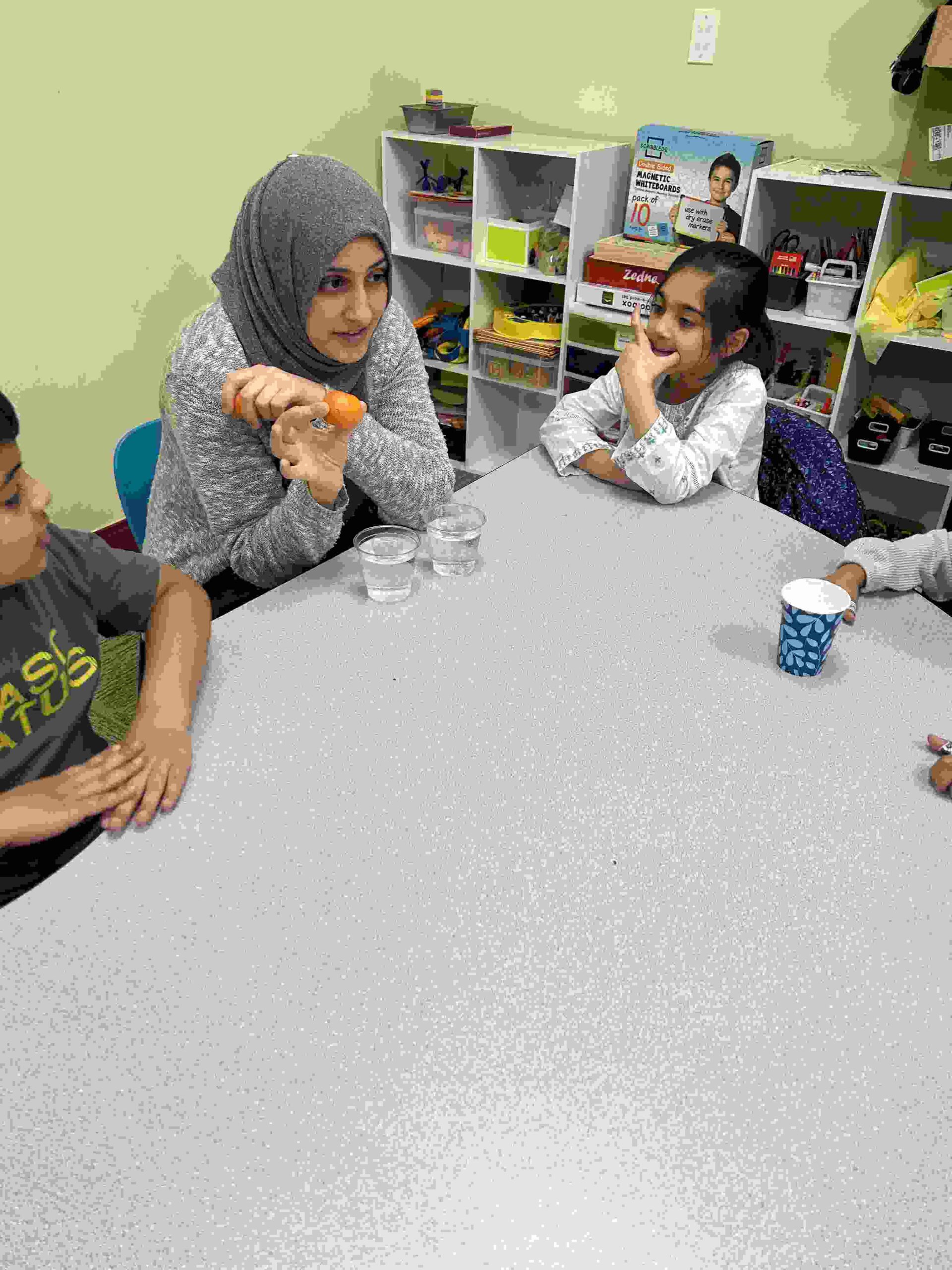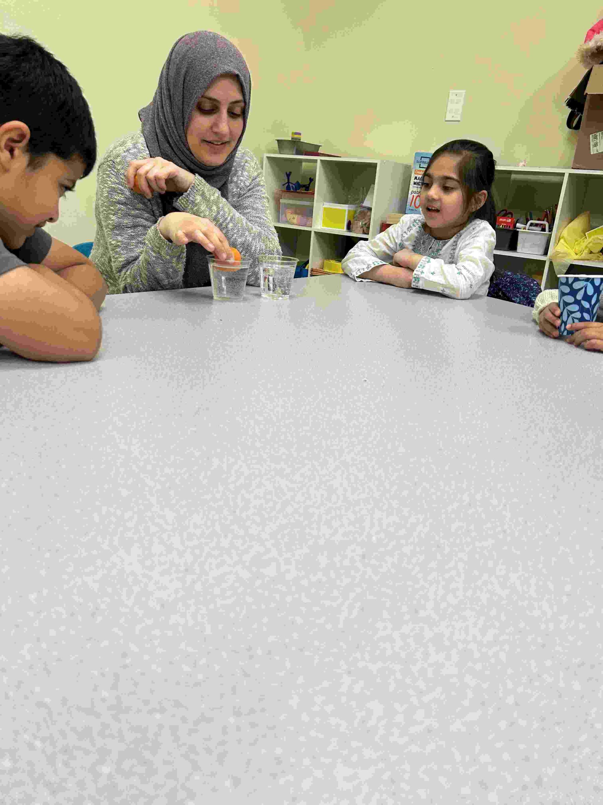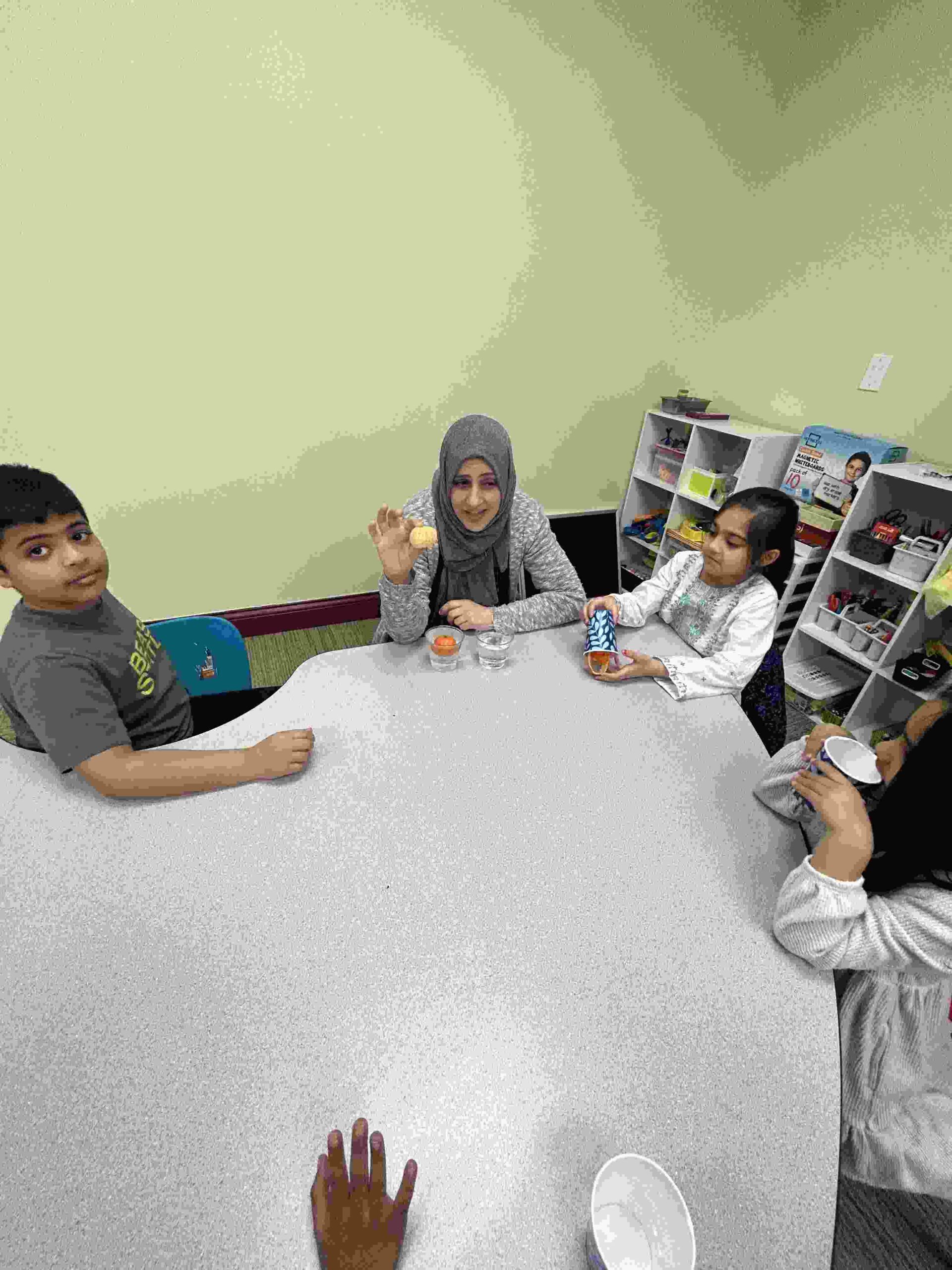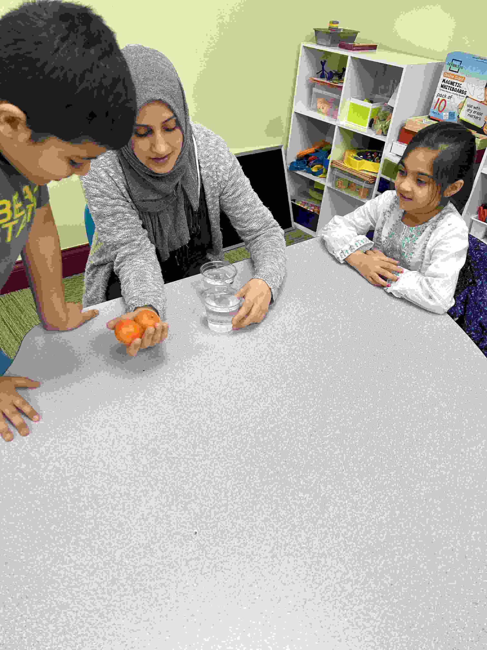 YA: We had a demonstration for the kids with a small cutie. The cutie floats when it has its peel on, and sinked without the peel. We explained to the kids that the orange peel is our certainty and trust in Allah’s guidance. With Allah’s help he will keep us floating and help us even in our most challenging times. Kids each had a turn to think of something personally challenging to them and drop the orange in the water.