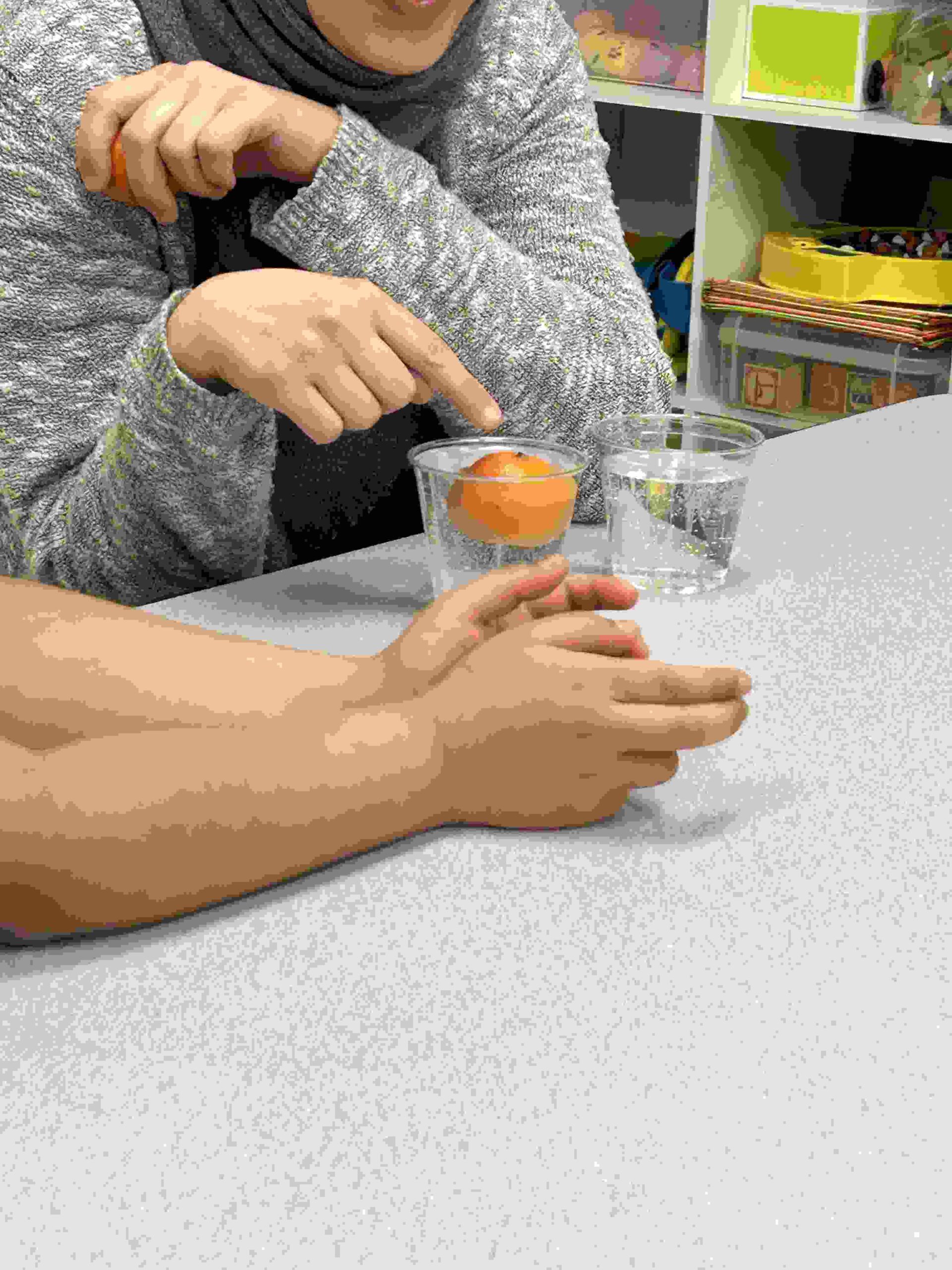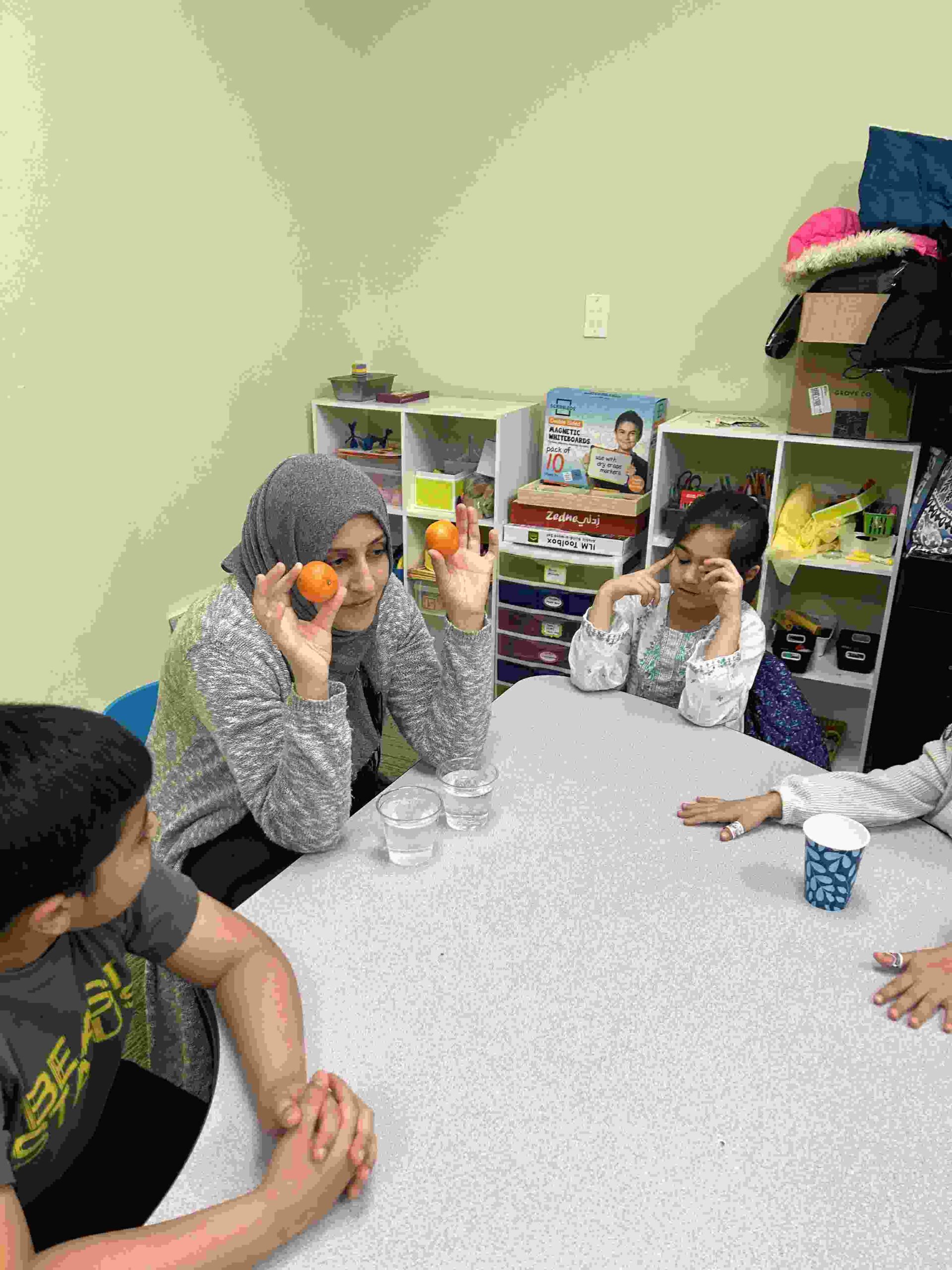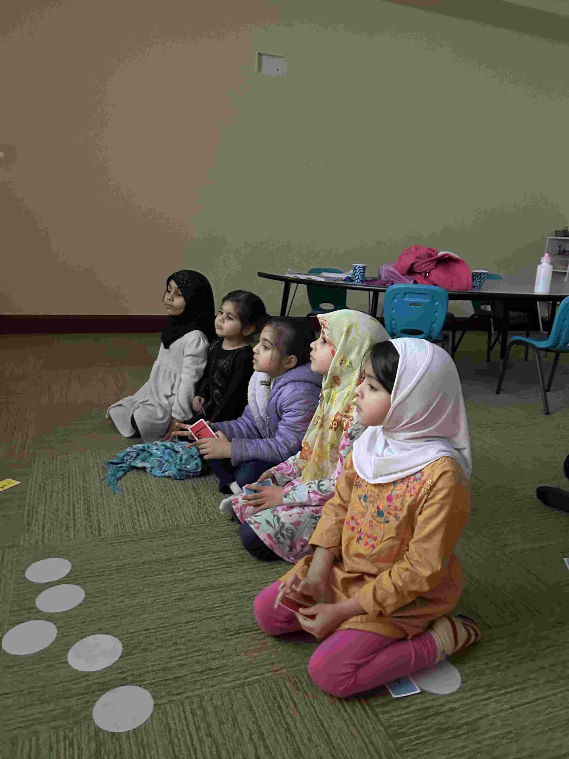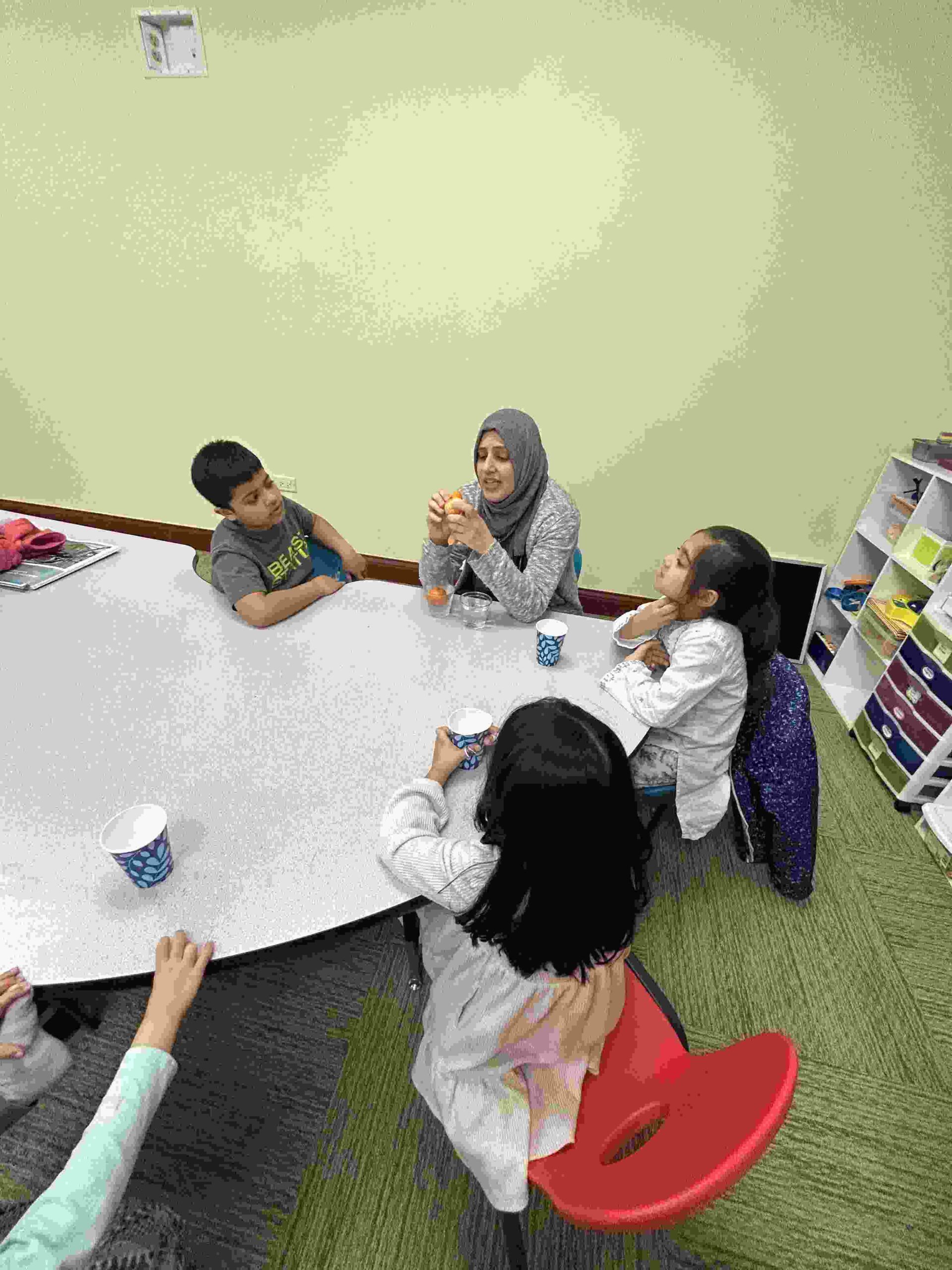 YA: We had a demonstration for the kids with a small cutie. The cutie floats when it has its peel on, and sinked without the peel. We explained to the kids that the orange peel is our certainty and trust in Allah’s guidance. With Allah’s help he will keep us floating and help us even in our most challenging times. Kids each had a turn to think of something personally challenging to them and drop the orange in the water.