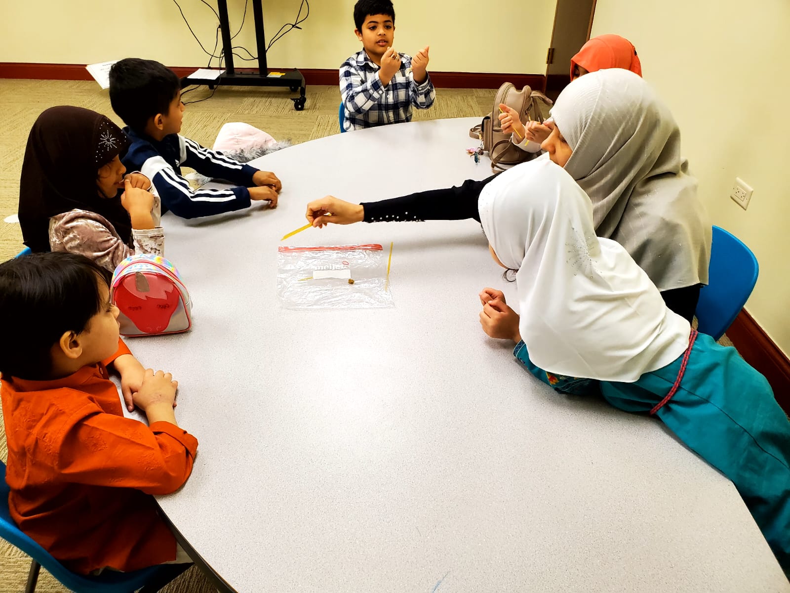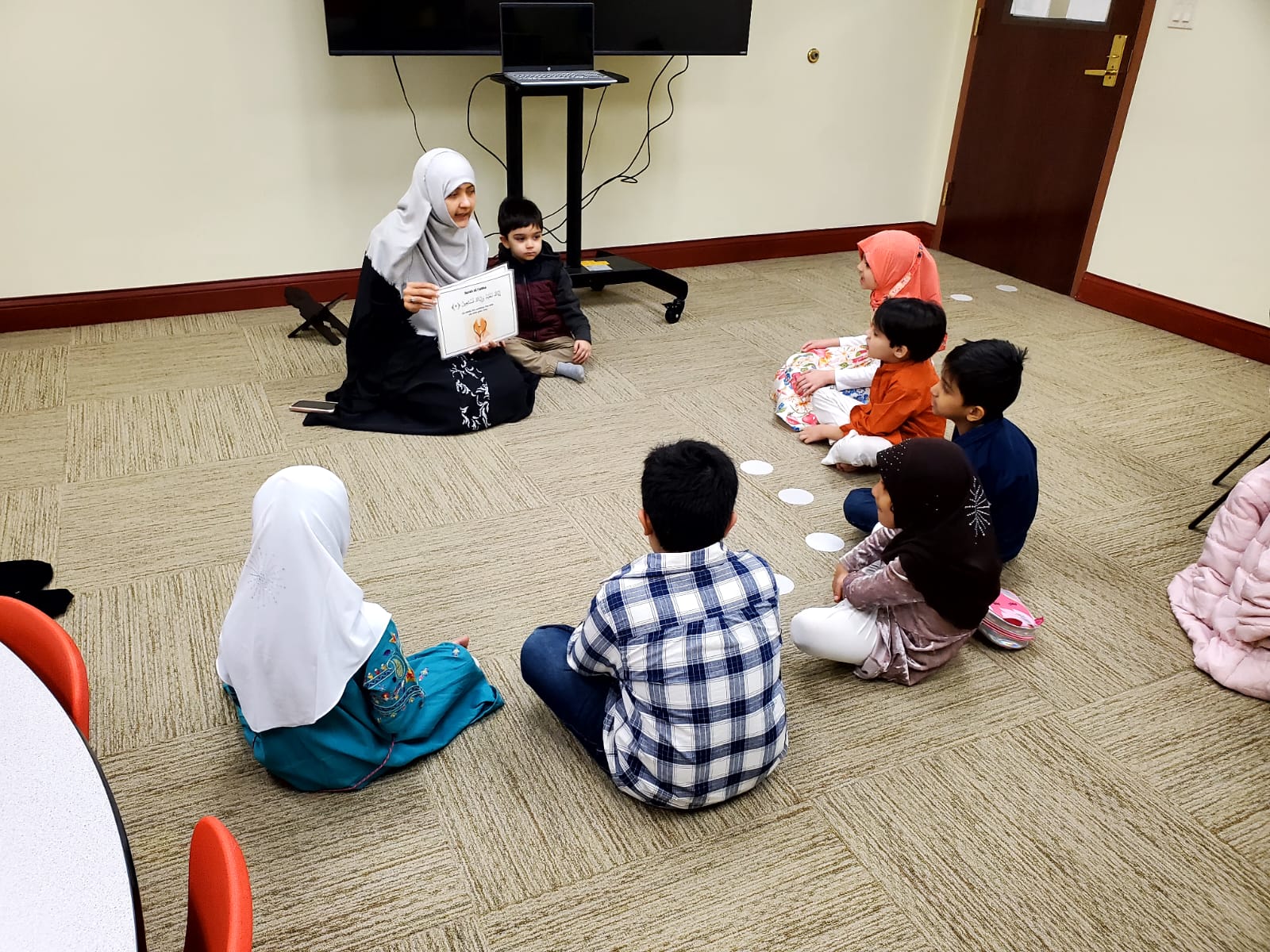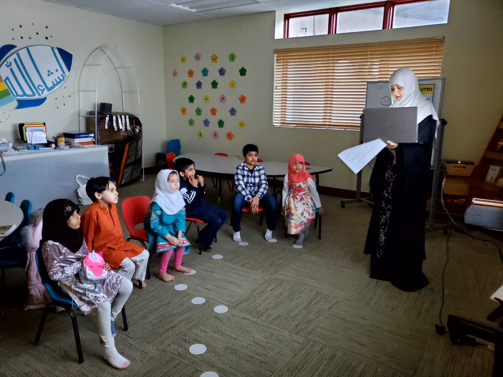 Kids are taking turns to have a one on one review of the recitation of Suratul Fatiha with a teacher.